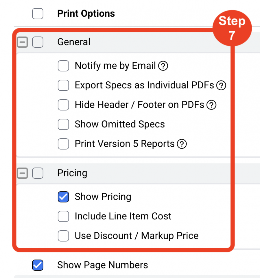 In order to print Spec Sheets and Spec Books, Printing Options selections must be selected under the Printing Options display dropdown.